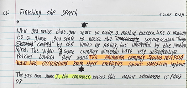When working to the dominant assessment model, feedback to writing can prioritise techniques above all else. The problem with this singular focus is that it disregards content and meaning: marking is directed towards how something is said, whether or not it is effective. This didn’t disappear completely during the project, as you can see in Example A below. However, in most cases, once students were guided to write a number of different pieces within a single unit of work, focus shifted more towards thinking about other aspects of writing, such as audience, purpose and form. In Example B, the teacher has made comments that are specific to the meaning of the speech, responding directly to the student’s ideas - ‘need to establish your expertise, who are you?’ and ‘rewrite this so you make the audience think about their children’. These comments work well because they encourage the student to think about how to do this, pushing for further experimentation and practice. The teacher’s written feedback here is more useful than in Example A because it engages with the student’s ideas and gets them to think about what they want to say, not just how they should say it. Consequently, the student is better placed to make tangible changes to their work.