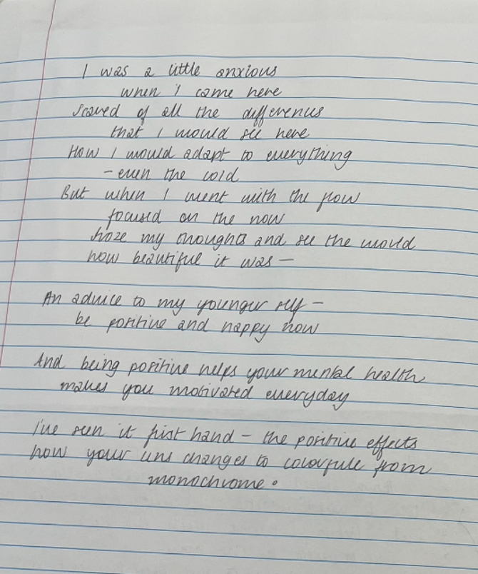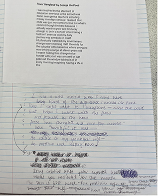 In another example, a student is using George the Poet’s ‘Gangland’ as inspiration for their own poem. The original is a spoken word, free verse poem about the poet’s experience of growing up on an estate in Neasden, Northwest London, while attending a selective grammar school in Barnet. In their own poem, the student is able to show their comprehension of the poet’s alienating experience through their own experience of moving to a different country. They also capture a sense of the original poem’s tone and language. What’s interesting in the student’s work is that they initially stay close to the ‘Gangland’ model, but in their redrafting and additions to their draft, they extend past this to offer advice to their younger self.